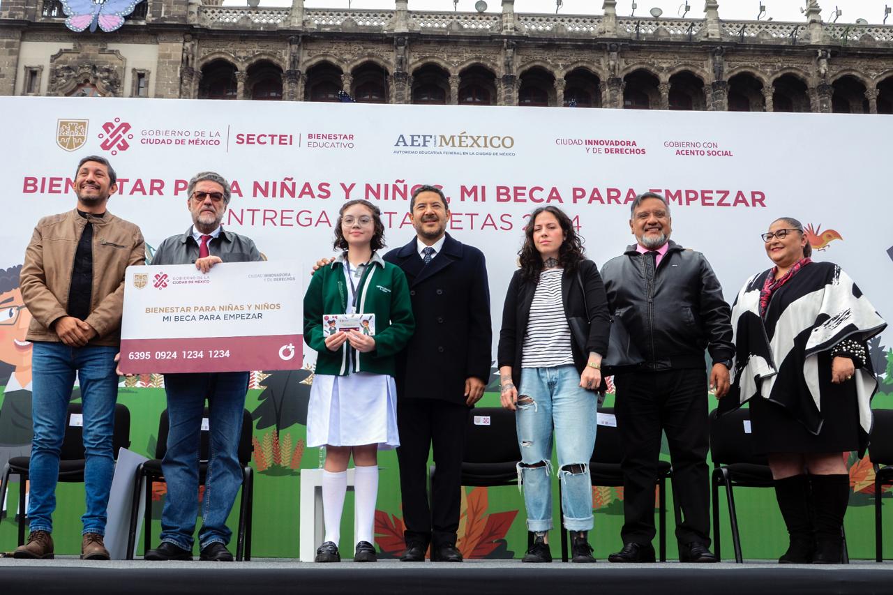 Al participar en la entrega de apoyos del programa “Bienestar para Niñas y Niños, Mi beca para empezar”, y en presencia del jefe de Gobierno de la Ciudad de México, Martí Batres Guadarrama, el titular de la AEFCM sostuvo que los incentivos que reciben estudiantes en la capital del país como “La Escuela es Nuestra, Mejor Escuela” y apoyo de uniformes y útiles escolares resultan determinantes para concluir sus estudios.